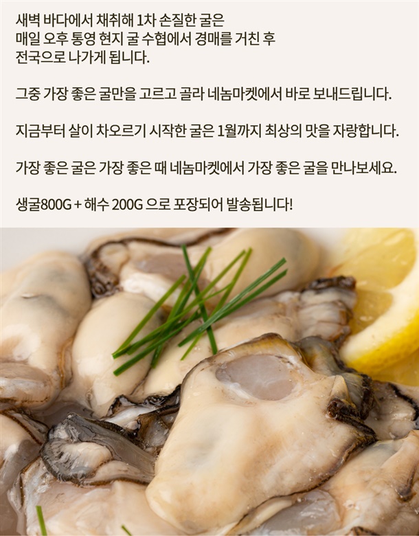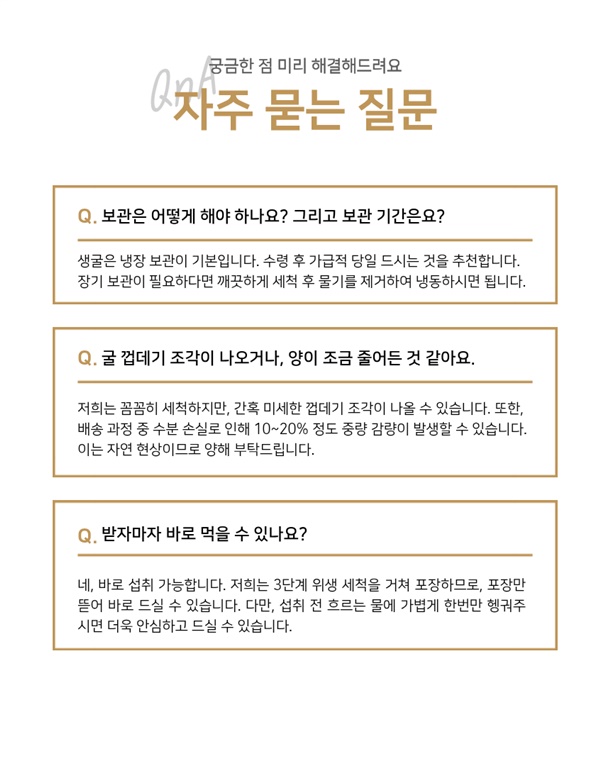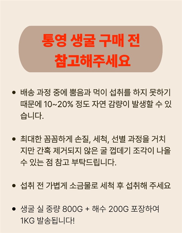 | 5.특이사항 | 해수 포장하여 발송 되지만 수분감량 생굴 특성상 10-20% 발생할수있습니다 |