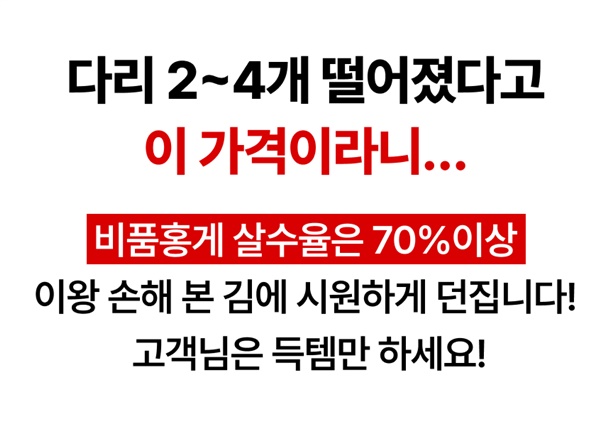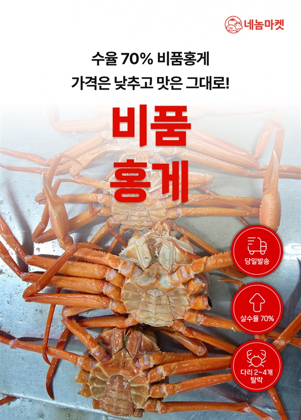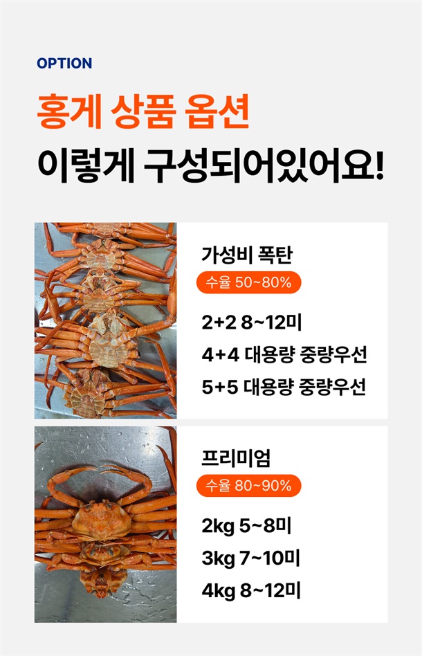 | 1. 포장단위별 용량(중량), 수량, 크기 | 홍게 2kg/5-8미 ,홍게 3kg/7-10미,홍게 4kg/8-12미 |